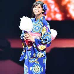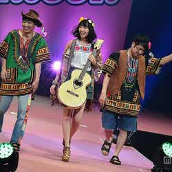 飯豊&中条は同イベントの司会をつとめたNON STYLEとコラボレーション。飯豊はボヘミアンスタイル、中条は色白美肌が際立つシンデレラのようなブルーのドレス姿で会場を盛り上げた。