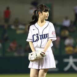 始球式後、浜辺は「始球式前に練習は少ししましたが、思っていたよりも投げられて良かったです。グラウンド上では、ドキドキで全然走ってもいないのに、息が乱れてしまいました」と振り返り、今回の投球の自己採点は「100点です!」と満面の笑み。「もしも2回目をやらせていただけるなら、120点を目指したいです!」と向上心を見せた。