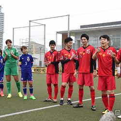 いざ対決が始まると両チームとも一切笑いはなし。体育会チームは全員がサッカー経験のある男性とはいえ、相手はW杯準優勝の現役なでしこJAPAN。試合開始直前、中学から大学までサッカーを続けてきた向井は円陣の中心で「勝つ!」と気合を入れる。