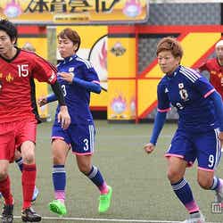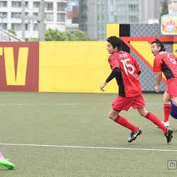長身を活かしたヘディングでなでしこゴールに襲い掛かるが、「いまのは入ったと思ったのに!」とクールな向井が珍しく感情をあらわに悔しがる場面も。さらに、「ここ1本止めましょう。鉄壁の守備で!」と守備をリード。快速ドリブラー菅澤選手と白熱のマッチアップを見せる。