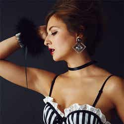 人気マンガ家の安野モヨコ氏と「Ravijour(ラヴィジュール)」コラボのランジェリー姿を披露したエリーローズ。ストライプサテンにおおぶりのパールとフリルが施されたクラシカルなビスチェにヒップをキュッと綺麗に魅せるフレアラインのショーツバックが特徴的なデザインは、安野氏の8年ぶりのストーリー漫画として話題を集める『鼻下長紳士回顧録』の主人公・コレットが着用するランジェリーや、作品のストーリー性を表現。細レースのガーターがよりセクシーさを際立たせている。