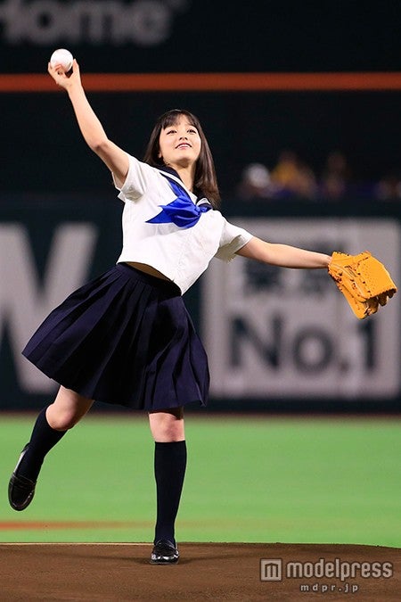 女優の薬師丸ひろ子が主演を務め、1982年に一大ブームを巻き起こした『セーラー服と機関銃』の、その後を描いたシリーズ最新作『セーラー服と機関銃–卒業-』(2016年3月5日公開)で主演・星泉役の橋本は、役衣装のセーラー服で姿を現した。37360人から歓声を浴びながら投げた球は、ノーバウンドでキャッチャーミットへ。まさに「カ・イ・カ・ン」ピッチングとなった。