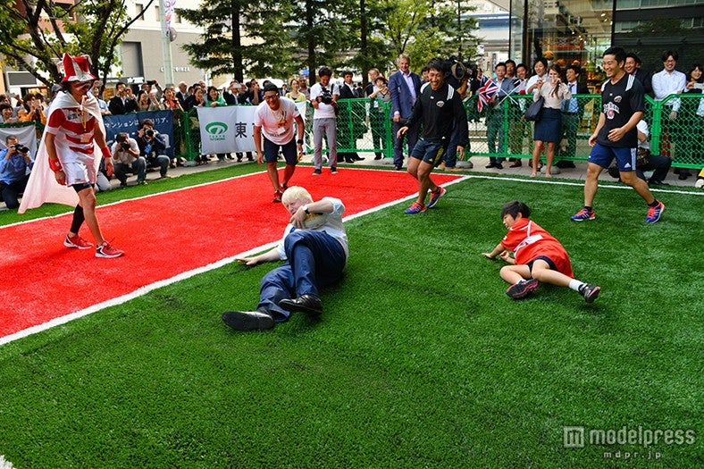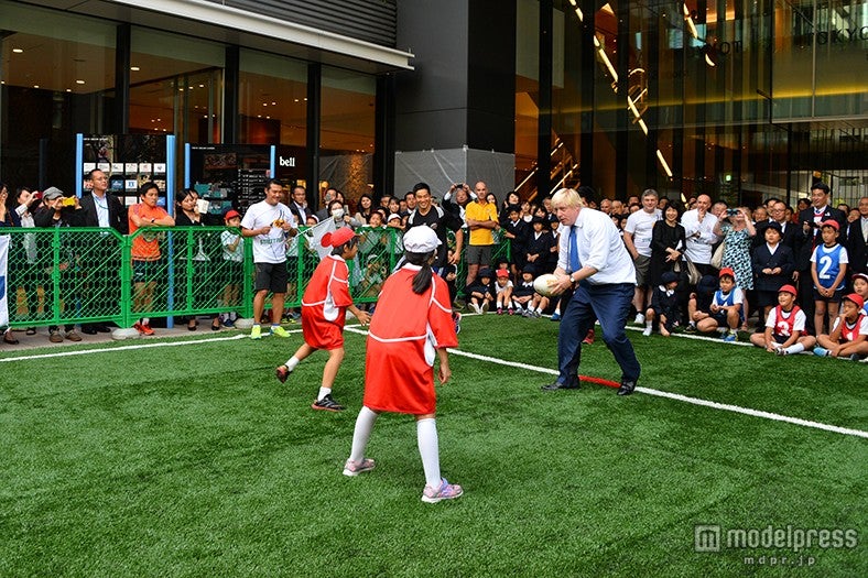 ジョンソン氏は、1872年にロンドンのパブでラグビーのルールが初めて制定されたというエピソードを紹介し、「今度はぜひ、みなさん、ロンドンにお越し頂いて、楽しんで頂けたらと思います」と笑顔。「2020年の東京オリンピック・パラリンピックの成功を、2019年のラグビーワールドカップの成功を祈念しています」とメッセージを送った。イベントでは、ジョンソン氏は子供たちが作った花道を通って、会場に姿を現した。途中、子供たちからサインを頼まれて笑顔で応える一幕も。子供たちと一緒に汗を流した後は、浮世絵で制作された似顔絵をプレゼントされ、終始、笑顔でイベントを終えた。
