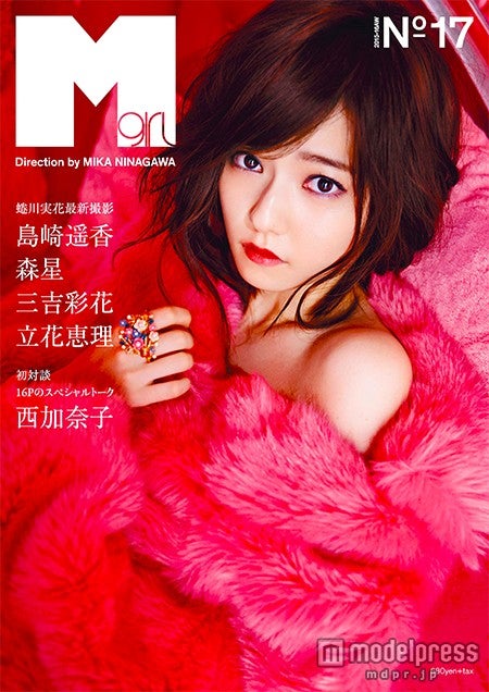 雑誌「Mgirl 2015-16 AW」では、島崎が初の表紙に登場。ヴィヴィッドピンクのファーに包まれ、アンニュイな表情を浮かべた彼女は、普段よりもぐっと大人な雰囲気。誌面では、美脚をあらわにした全身カットやファーを脱ぎ捨てブラックのキャミソール1枚になったカットも披露しており、艶やかなメイクとあえて素足のスタイリングが色っぽい。一方、「MODE IN BLACK」をテーマにクールなビジュアルを披露した森は、トレードマークのビッグスマイルを封印。レザージャケット×レオタードという攻めのコーディネートで、新たな魅力を開花させた。