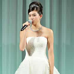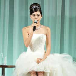 1日、都内で行われた『25ansウエディング』(ハースト婦人画報社)創刊30周年記念イベント「スペシャルドレスコレクション」にゲスト出演。BVLGARIのティアラを身に付け、純白のウェディングドレス姿で登場した森は「前が二丈になっていて、ちょっと可愛らしさもあるんですけど、後ろのトレーンも長いので今注目されている大人カワイイ感じで、何歳の方でも似合うドレスだなと思います」と感想を語り、同ドレスを選んだ理由については「フィッティングをしたんですけど、素敵なドレスがいっぱいあって悩みました。今日のお客様はカワイイのが好きかなと思って、これをチョイスしました」と明かした。さらに、ティアラを付けて「プリンセスになった気分」と笑顔を見せた。