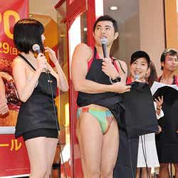 27日、都内で行われたサンドイッチ・チェーンの発表会に、お笑いタレントの小島よしお、グラビアアイドルの森下悠里とともに出席。CMキャラクターの板野は1日店長を務めた。
