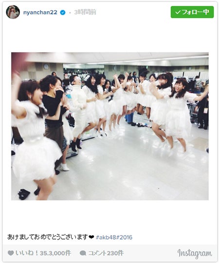 アーティストは毎年番組出演に大忙し。「第66回NHK紅白歌合戦」(NHK、31日放送)、「CDTVスペシャル!年越しプレミアライブ2015→2016」(TBS系、放送中)とはしご出演したAKB48には毎年恒例の年越し方法があるようで、メンバーの小嶋陽菜はInstagramにて「恒例 年越しの瞬間は紅白の楽屋でみんなでジャンプ」とメンバー同士手を繋ぎ、ジャンプする瞬間のショットを公開した。前田敦子&大島優子は「新年ほろ酔い」