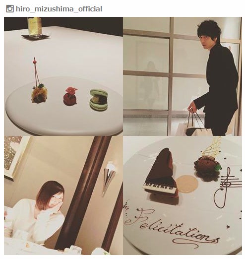 リラックスした笑顔を浮かべる絢香と自身の姿、そしてディナーの様子をコラージュした写真を公開し、「2.22 was our 7th wedding anniversary. 」とつづった水嶋。ピアノを模したデザートのプレートには「felicitations ※フランス語で『おめでとう』の意味」と記念日を祝福するメッセージが描かれている。