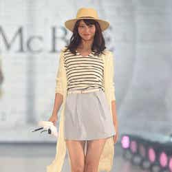 ボーダートップス×アイスブルーのタイトスカートに白のロングカーディンガンを羽織り、ハットとヒールを合わせた爽やかな春のコーディネートに身を包んで「CECIL McBEE」ステージに登場した永田。ランウェイ先端では観客へプレゼントを投げるサプライズもあり、会場を沸かせた。