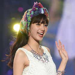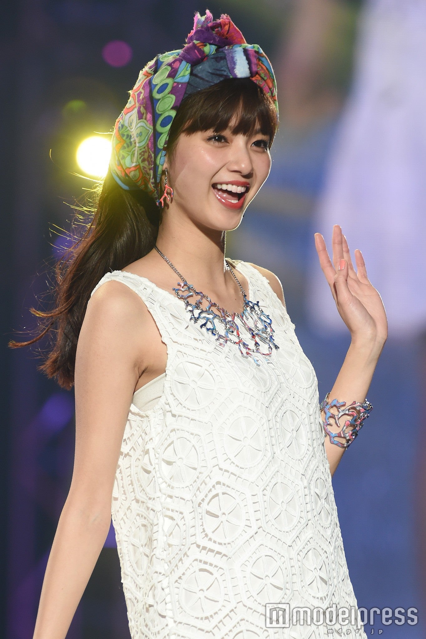 「Desigual」ステージに登場した新川は、白のレースをレイヤードしたワンピースでヘルシーに素肌見せ。カラフルで個性的な柄のスカーフ、アクセをアクセントにした爽やかな春スタイルで笑顔を振りまいた。