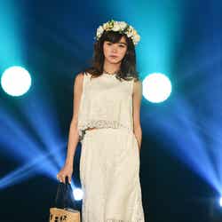 オープンニングの「JILL by JILLSTUART」ステージに登場した池田は、透け感たっぷりなレース素材のノースリーブ×スカーチョのオールホワイトコーデで軽やかにランウェイをウォーキング。大歓声を浴びながらランウェイ先端ではキュートな投げキッスを披露し、会場を沸かせた。