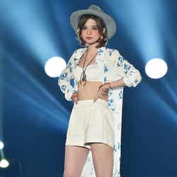 「EGOIST」ステージに登場した瑛茉は、白を基調としたチューブトップ×ショートパンツ×ロングシャツのサマーファッションを着こなし。スラリと伸びる美脚や美しいバストを惜しげなく披露した。