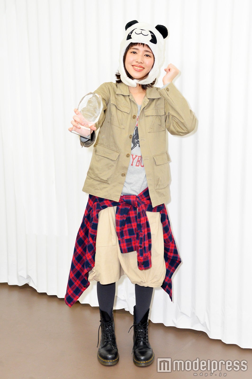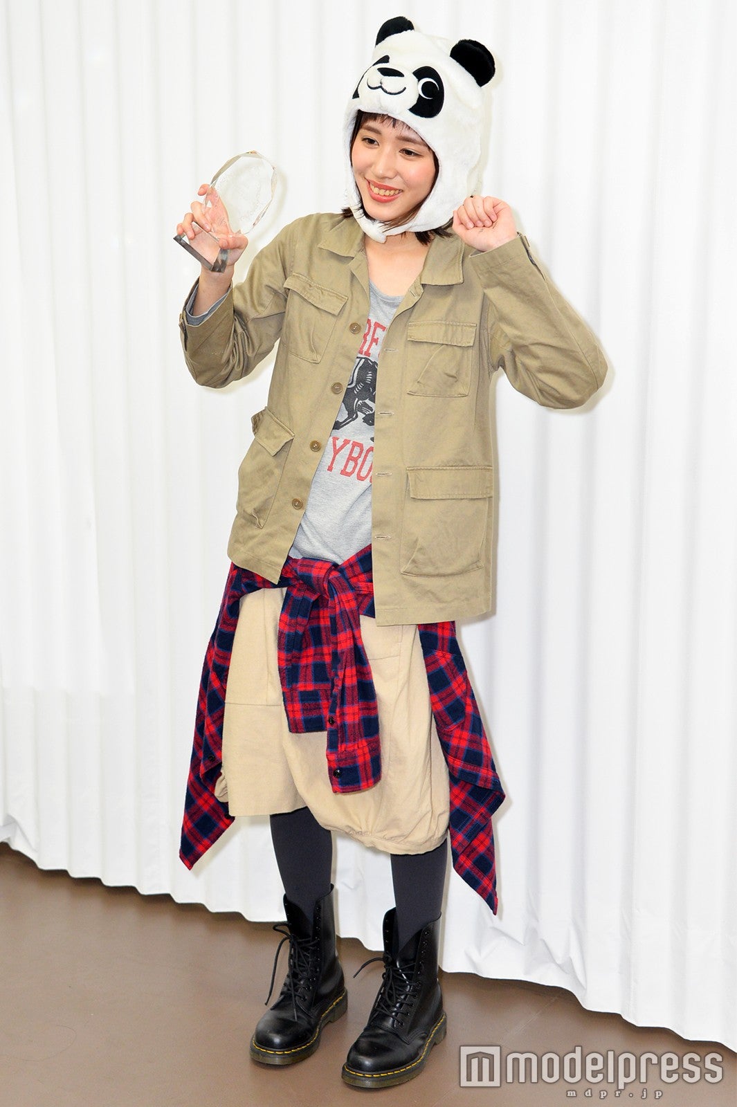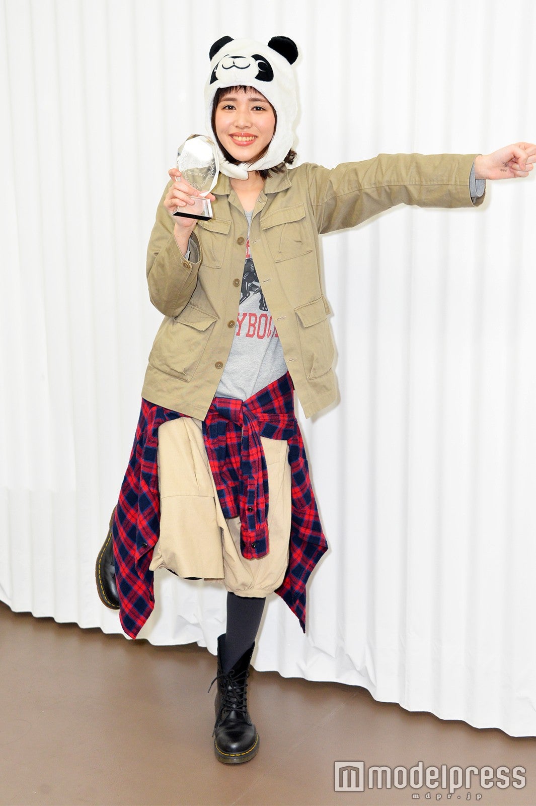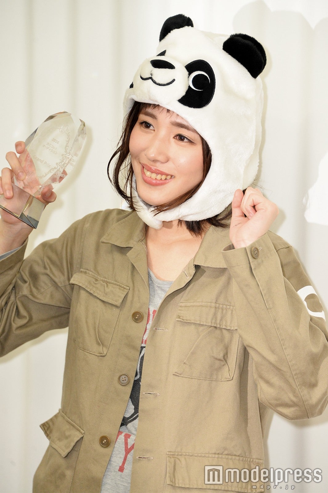 同オーディションは、「自分の中にある神を探してみよう」をテーマに、全国5ヶ所で1次、2次審査が行われた。この日は、約3000人の中から勝ち残ったファイナリスト11人が、歌、ダンス、ラップ、朗読、少林寺拳法の型、音楽に乗せたシャドウボクシング&リフティングなどのパフォーマンスを行った。原さんは、パンダの着ぐるみを頭に被り「アジアの純真」(PUFFY)を熱唱。着ぐるみは歌詞の中にパンダが登場するため被ったそうだ。池田エライザが“人間力”を絶賛