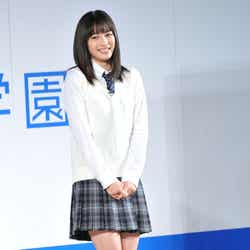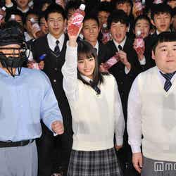 モデルで女優の広瀬すずが14日、都内の学校で行われた炭酸飲料の新CM発表会に出席。高校生の青春を応援するというCMの世界観を表現するために、同学校に新たに新設される映像研究部の部長という設定でサプライズ登場して、1000人もの生徒の前で新CMを披露した。