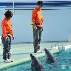大手商社から系列の「はまかぜ水族館」に異動を命じられた嶋由香(松岡)が、イルカや生き物たちと向き合い悪戦苦闘しながら成長していく姿を描いた同作。人と人の心のつながり、いのちの重さ・尊さ、家族の大切さ、そして恋の行方など見どころ満載で届ける。松岡は「最初に『呼吸や目を合わせて』とうかがったときは、どういうことかなと思っていたんですけど、本当に目が合って『今サインを出したら行ってくれる』というのが伝わってきて、本当にイルカって意思の疎通ができるんじゃないかなって思っています」とコメント。「イルカがだるそうにしているときは『今ダメだな』と思ったりしますし、今のように大技を成功させてくれたときは、『ありがとう、ありがとう』と言いながら餌をあげています」と体験談も明かし、「ドラマの終盤を迎えるときに、ここにイルカたちに会いに来たいなと、今から寂しくなっています」と胸の内を明かした。