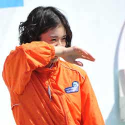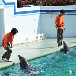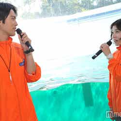女優の松岡茉優が19日、都内の水族館で行われたドラマ10「水族館ガール」(6月17日より毎週金曜22:00~、NHK総合)のロケ取材会に、俳優の桐谷健太とともに出席。この日、約2か月前からそれぞれ練習を重ねていたイルカのトレーニングを披露して大技を成功させた。
