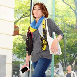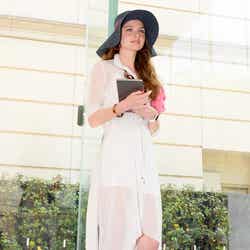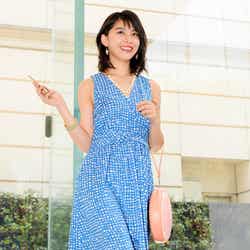 田中はチェック柄のワンピースで美脚を披露。水色×イエローのポップなサンダルを合わせた、爽やかな夏の装いに仕上げた。