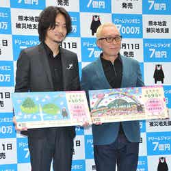 今作は、綾野が演じる地球防衛隊の隊員が、所が演じる天才科学者の作った高額ロボット購入しようとしている姿を描く。CM出演の感想を聞かれると、綾野は「まさに夢のようでしたし、初代宝くじのCMキャラクターをされている所さんとご一緒できるのは、やっぱりすごく嬉しかったですね」と感慨深げに語り、「CMの現場も所さんがカジュアルに接してくださったので、すごく楽しかったです」と笑顔を見せた。収益金の一部が熊本地震の被災地支援に