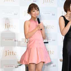 手島は「本当にケアには気を遣っているの。肌が綺麗じゃないとモテない!だって今、ツヤ肌が流行っているじゃない。お顔とかでも。全身のツヤは大事!」と“ツヤ肌”キープを心掛けていることを紹介。そんな手島の背中に興味津々の鈴木は手を伸ばし、「ツルツルな背中!」と驚いていた。そして、背中だけに飽き足らず、手島の全身を触り始め、胸元に顔を埋めてしまう鈴木。「手島さんをダンナさんに見せたくないかも。すごい色気があるし」と軽快なトークでイベントを盛り上げた。