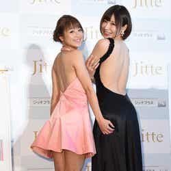 モデルでタレントの鈴木奈々が15日、都内にて開催された商品発表会に、グラビアアイドルでタレントの手島優と出席。2人は、背中を大胆に露出したセクシーなドレス姿で登壇した。