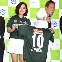 モデルでタレントの筧美和子が27日、オーストリアのサッカークラブ・SVホルンの公式スポンサー就任記念記者発表会に、お笑いタレントのじゅんいちダビッドソンとともに出席。同クラブの実質的オーナーを務める本田圭佑選手のものまねでブレイクしたじゅんいちとはこの日が初対面となり、「本田さんのファンなので、すごく楽しみにしていたんですが、やっぱり違うんだなって…」と声のトーンを落として話したが、「じゅんいちさん自身もテレビで見ていて、面白くて大好きだったので、生でこういうのを見られて嬉しかったです」とニッコリ。筧の言葉を受けて、じゅんいちは「うまいこと後半フォローしていただいてありがとうございます」と胸を撫で下ろした。