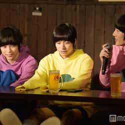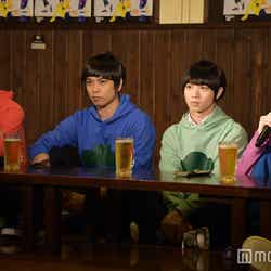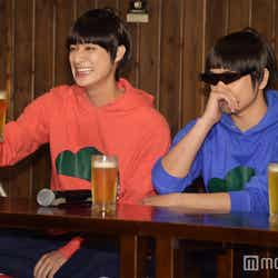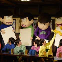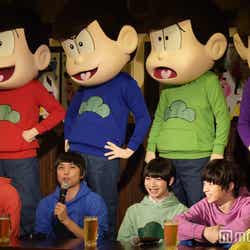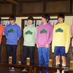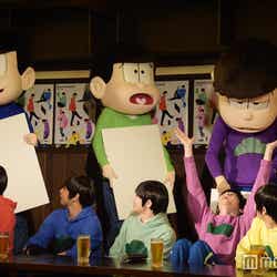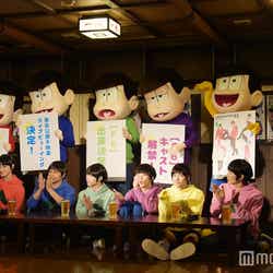 赤塚不二夫生誕80周年を記念して昨年10月より放送されたTVアニメ「おそ松さん」は、大人になってもマイペースでニート生活を謳歌する個性豊かな6つ子の日常を描いたギャグコメディ。この日は6つ子が足繁く通う居酒屋を会見場とし、キャスト陣の前にビールジョッキが並ぶ異例のスタイルで和気あいあいと進行した。