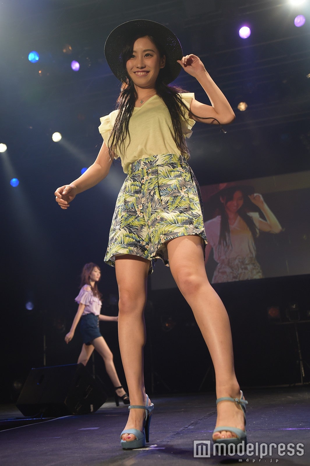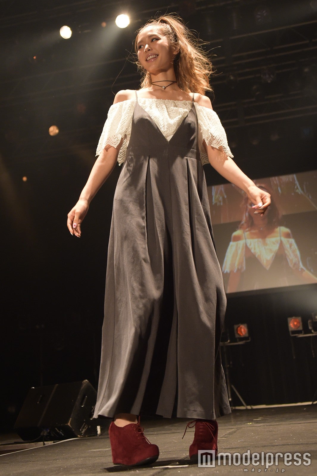 「DURAS×LIP SERVICE」のファッションステージで、DURASのグレーロンパースに千鳥格子柄のベレー帽を合わせた着こなしで登場した武田。ステージに姿を現すなり、観客からは「可愛い~!」と歓声が上がり、笑顔で手を振って応えていた。水沢アリー、ミニスカ美脚で視線独占