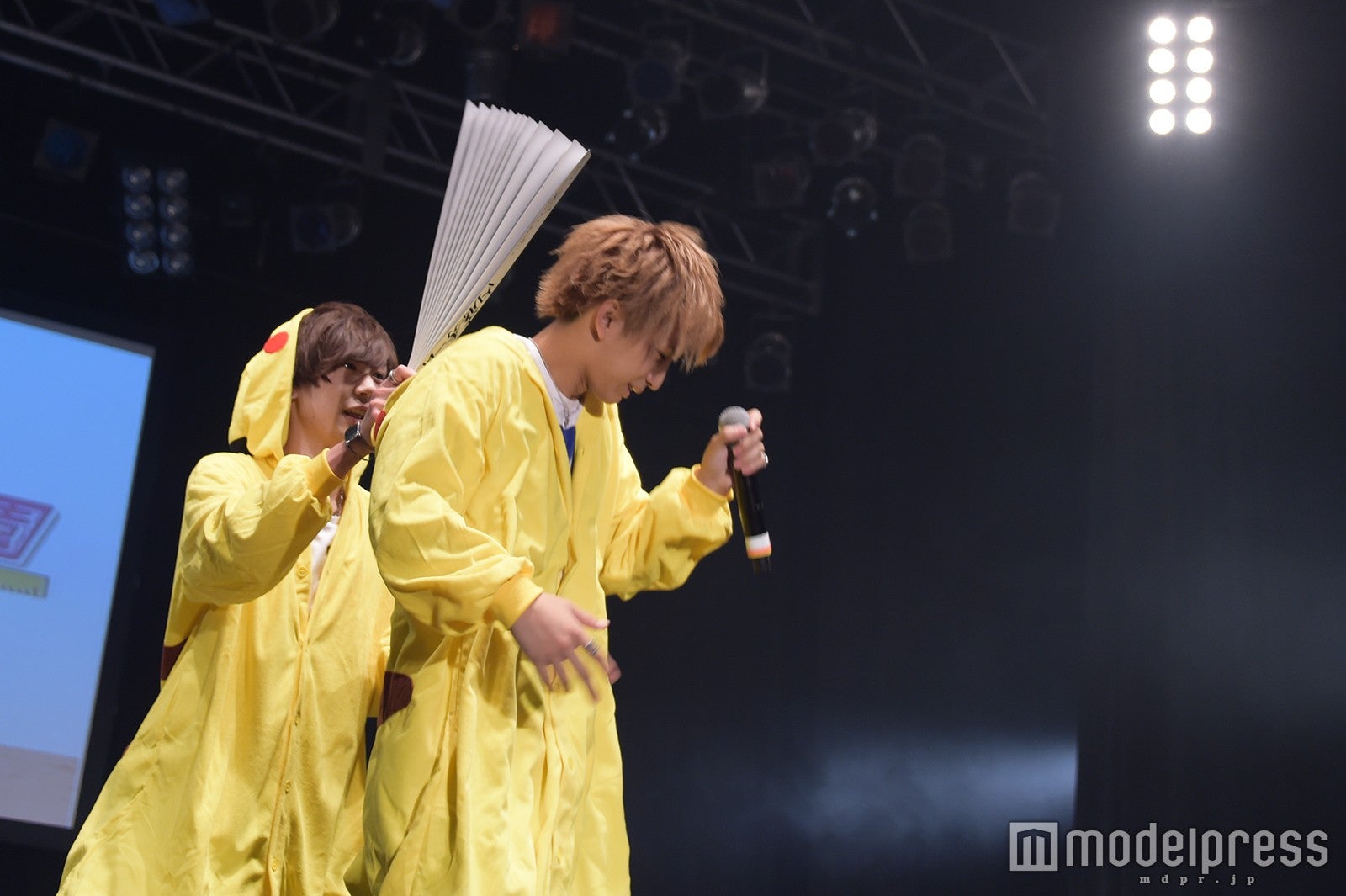 白いシャツ×グレーのニットベストにブルーのパンツを合わせたプレッピースタイルのこんどうが登場すると、大歓声が沸き起こり会場は青いペンライト一色に。“逆さま歌詞”で話題の、9月28日発売の新曲「だンオイラ」を披露すれば、たちまち観客も「だンオイラ!」と掛け声を上げ、盛り上がる。こんどうは、春に実施した「こんどうようぢ弟オーディション」でファイナリストに残った弟3人のうち2人、バックダンサーも務めた山中夕葵と高松アロハ勇人を紹介。「ゆうなって呼んでください!」「アロハって呼んでください!」と元気にアピールする2人に、会場は熱狂の渦に包まれた。