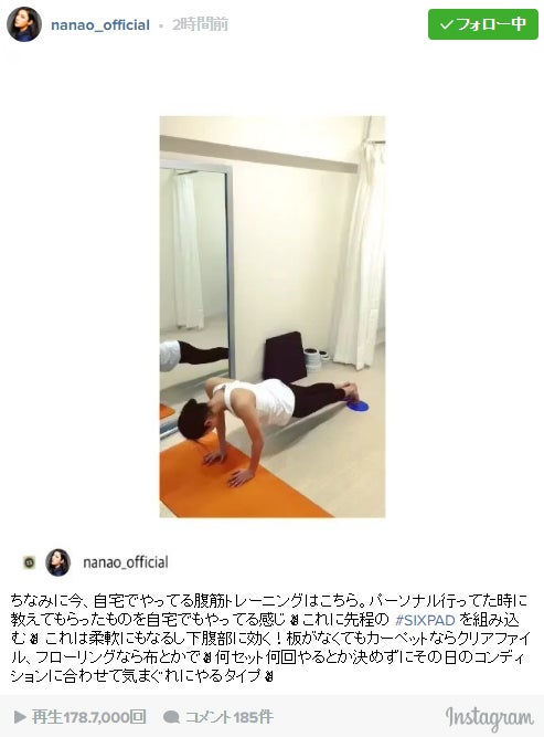 モデルで女優の菜々緒が23日、自身のInstagramを更新し自宅で行っているという腹筋トレーニングの動画を紹介。ストイックな姿勢が反響を呼んでいる。