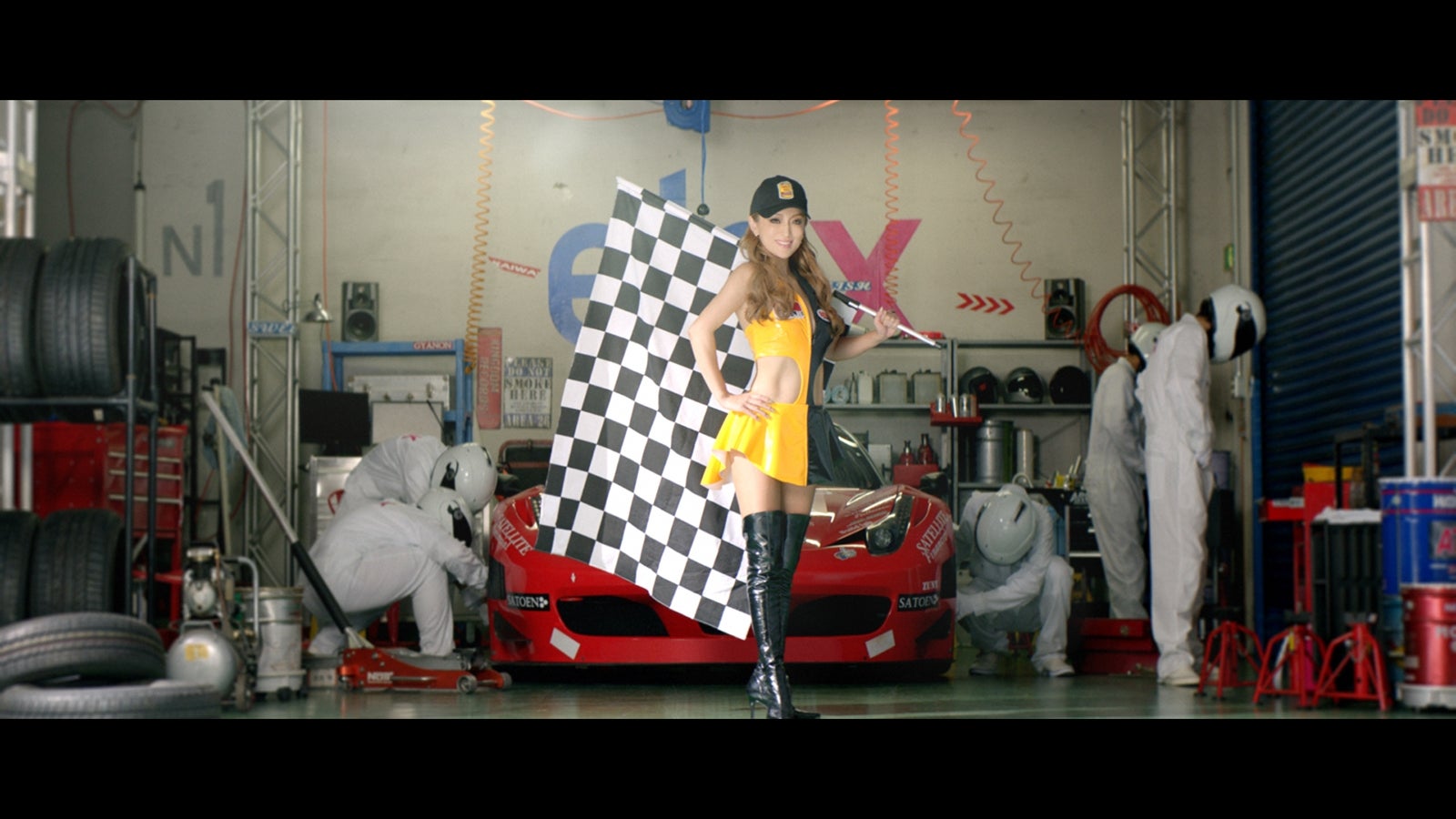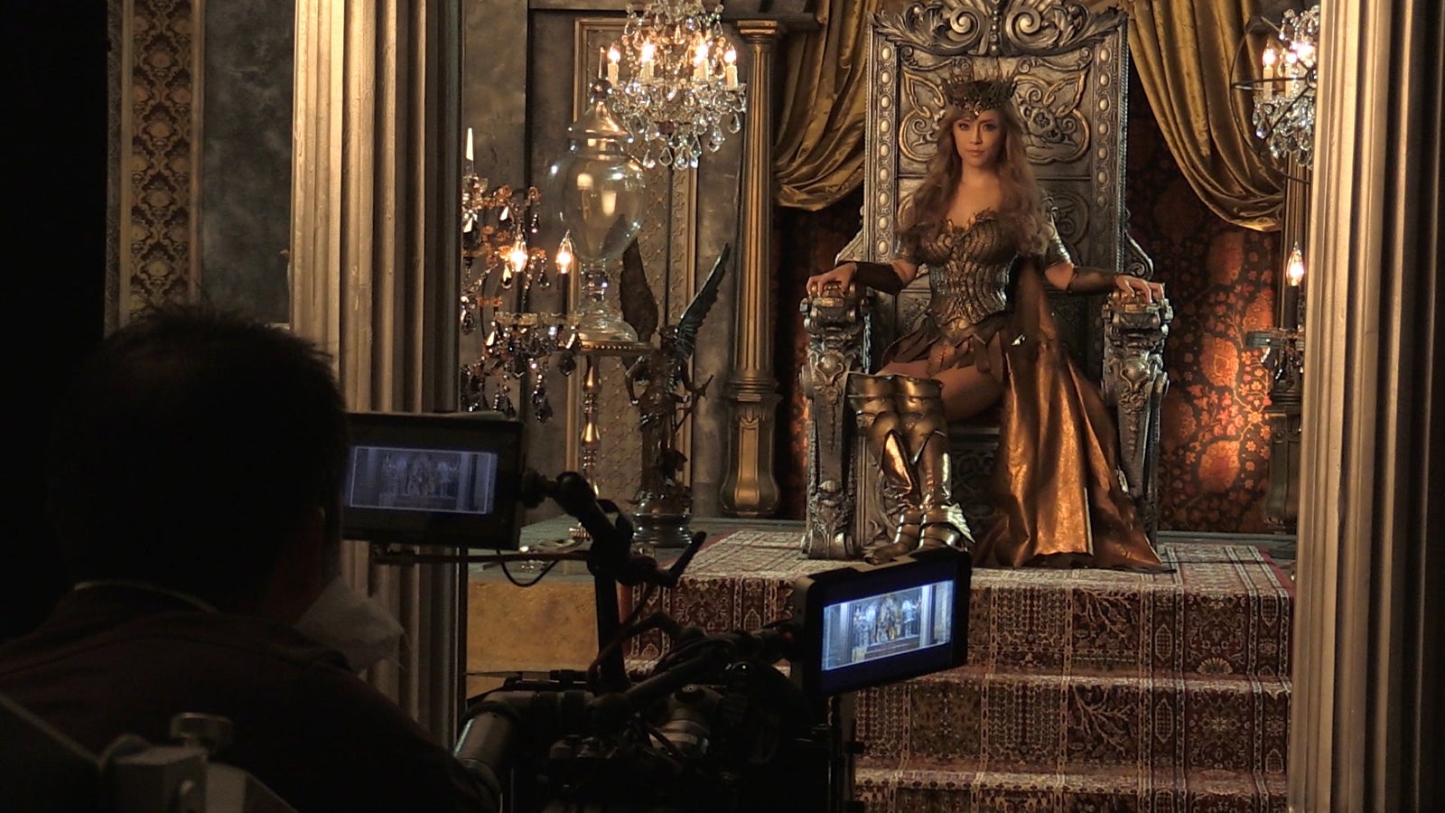 CMでは、頭には豪華な王冠、足元は膝が隠れるほどのロングブーツ、背中には大きなマント、さらには長さ130cmの剣を持ち、“フル装備”となった浜崎。「凄く似合うね!」という声が飛び交うなか、“クイーン”は終始堂々とした演技を披露した。対して“レースクイーン”の衣装では、胸元が開き、美しいくびれが強調されたセクシーな姿に。真っ赤なスポーツカーの前でポージングするシーンでは、総勢約30名のカメラマンに扮したエキストラとともに迫力溢れるシーンを作り上げた。