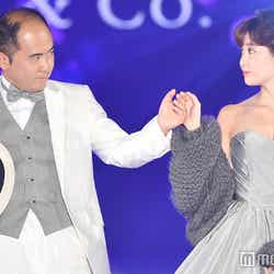 「sweet×FOUR SIS & CO .」スペシャルステージのラストに、バストがちらりと見えるグレーのシックなウエディングドレス姿で登場した小嶋。エスコート役には、シークレットゲストとして斎藤司が抜擢され、ひざまずいて優雅に小嶋の手をとった。にっこりとランウェイを歩む小嶋に対し、ステージ先端では斎藤が転びそうになり、笑いが起こる一幕も。