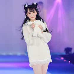 「dazzlin」ステージに、グレーのニットにピンクのミニスカートを合わせたガーリーなモテコーデで登場。ランウェイ先端では、絶妙に手元まで隠れた“萌え袖”を見せながらキュートにポージング。グループ内でも随一の私服センスの持ち主として知られる伊藤。初とは思えない堂々としたランウェイに会場には「可愛い!」という歓声が響いていた。