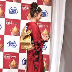 艶やかな着物姿で登場したダレノガレは、「プレミアムっぽくて、安納芋っぽいお着物を選んでみました。帯が安納芋のゴールドっぽいところで、安納芋と言ったら赤なので」と商品にちなんだ衣装であることを説明。ソフトクリームは好きだが、あまり食べる機会がないといい、「地方に行ったときにそこのソフトクリームを食べたりします」と明かした。