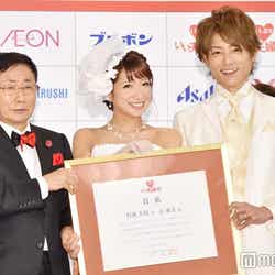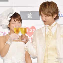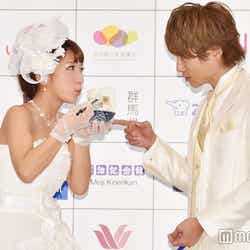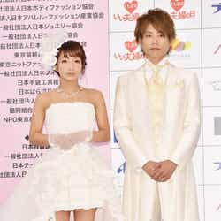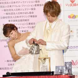 さらに、ブライダルファッションデザイナーの桂由美氏がデザインしたドレスに身を包んで登場した辻を横に、杉浦は「もう一度結婚式を挙げたような気持ちにさせていただきました。20代のうちにウェディングドレスを着たいねと話していたので、素敵な会に呼んでいただきありがとうございました」と感謝した。