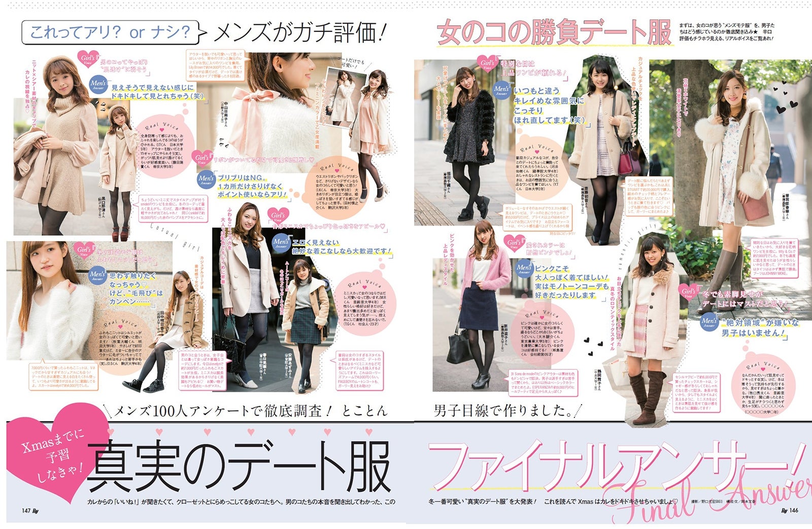 また、企画内では「理想のクリスマスデートって?」という質問に対してガールズトークを展開。「めっちゃベタなやつがいいなぁと思ってて。すごい寒い中を歩いていて、そしたら彼が手を握ってくれるみたいな(照)。恥ずかしー!」(鈴木)、「私は都会を離れて、田舎に行きたいなぁ。それで星を見るの」(松井)、「私はお家でゆっくりしたいほう。ディナーでちょっと素敵なレストランにお出かけするくらい」(白石)など、それぞれが持つ妄想クリスマスデートを語り合う。