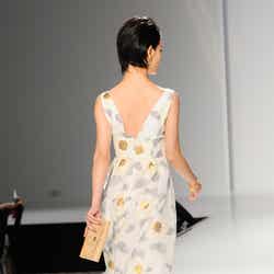 フィナーレも剛力が飾り、ロングドレス姿でランウェイを闊歩。トレードマークの笑顔を封印し、イメージを一新。胸元、背中が開いた色っぽいドレスで大人の魅力をアピールした。