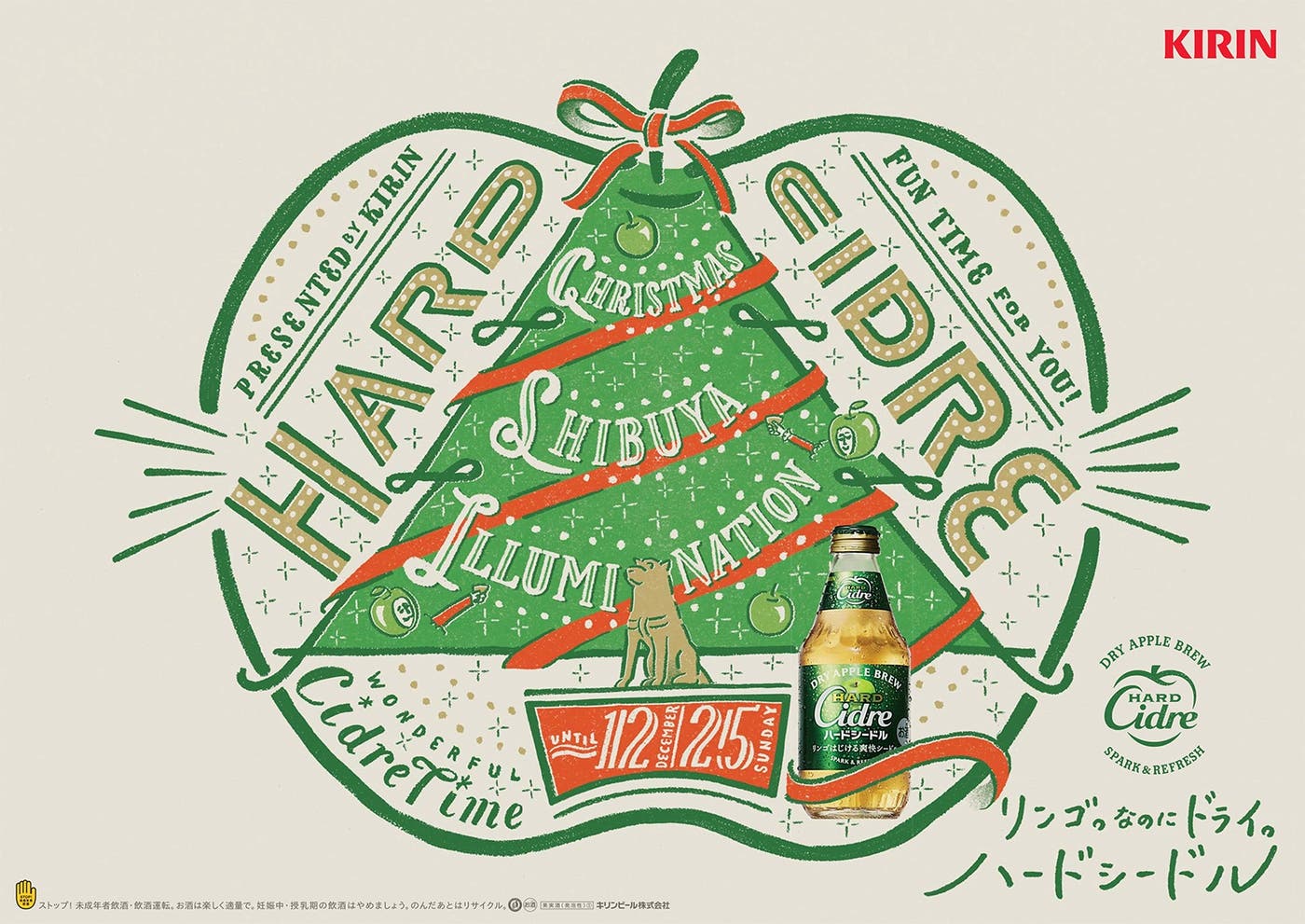 12月9日(金)から12月25日(日)までの期間中、約8メートルのクリスマスツリーをハチ公前に設置。約4万球のグリーンLED電球で、ツリーや周辺の樹木がライトアップされている。今回の渋谷イルミネーションは「キリン ハードシードル」とコラボ。「Open Up a New World」をテーマに、ブランドカラーであるグリーンと、「キリン ハードシードル」のリンゴをイメージさせるオーナメント装飾が渋谷のクリスマスを鮮やかに照らす。ハチ公も緑のサンタ帽とマフラーでおめかしし、今しか見ることのできない“緑サンタ”に変身している。