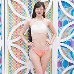 上下別柄のミックスマッチ水着のステージでは、山本成美がエスニック柄&無地バンドゥビキニに挑戦。2017年注目のエスニック柄とサイド紐の先についたターコイズがアクセントになった最旬デザインをヘルシーな色気たっぷりに着こなした。花柄&ボーダーオフショルビキニを着こなした蘭。オフショルデザインでトレンドをおさえつつ、ブラもショーツもインパクト大なデザインのミックスマッチで存在感をみせつけた。