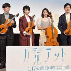 女優の松たか子、満島ひかり、俳優の高橋一生、松田龍平が9日、都内にて行われたTBS系新ドラマ「カルテット」(毎週火曜よる10時~/1月17日スタート※初回15分拡大)特別試写会&舞台挨拶に出席した。