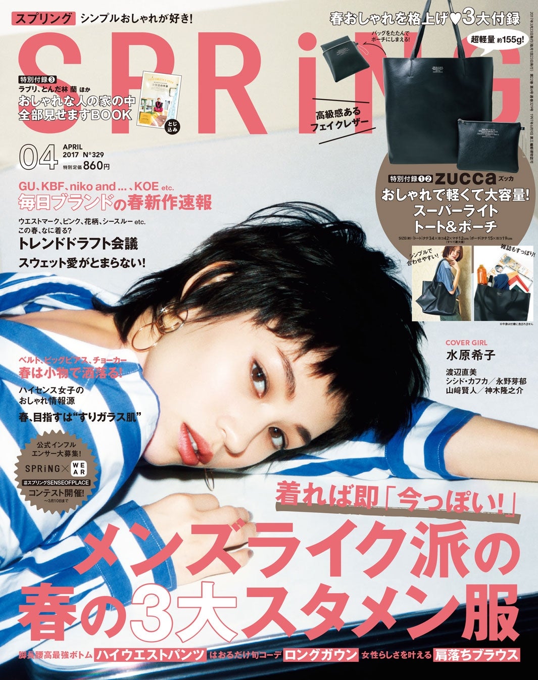 モデルで女優の水原希子が雑誌「SPRiNG」4月号の表紙に登場。黒髪のベリーショートヘアを披露した。