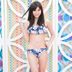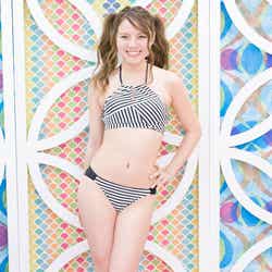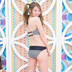 「今どき女子の2way水着」のテーマでは、個性的デザインの水着がラインナップ。蘭は、アンダー紐の取り外しができるペイズリー柄クロッシーハイネックビキニで魅了。