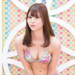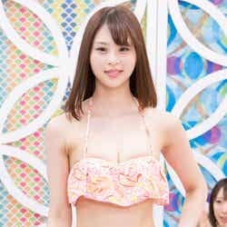 最初のテーマは“花柄水着”。松山英礼奈は鮮やかなイエロー花柄ビキニ&ブラウスで登場。透け感あるスカートとブラウスが涼しげで、体型カバーもできる水着を着こなした。山本成美は、濃いピンクと爽やかなグリーンの組み合わせが上品なスタイルに仕上がる花柄ビキニ。ワイヤー入りのホルタ―ビキニでしっかりバストメイクできるビキニとあり、バストがより美しく際立っていた。