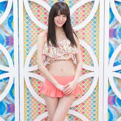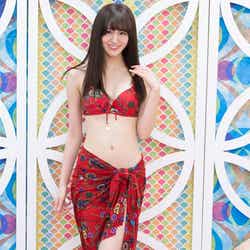 沖舘はカシュクールデザインの花柄ビキニに挑戦。夏を感じる華やかな色合いと胸元のチャームが目を引くデザインになっている。