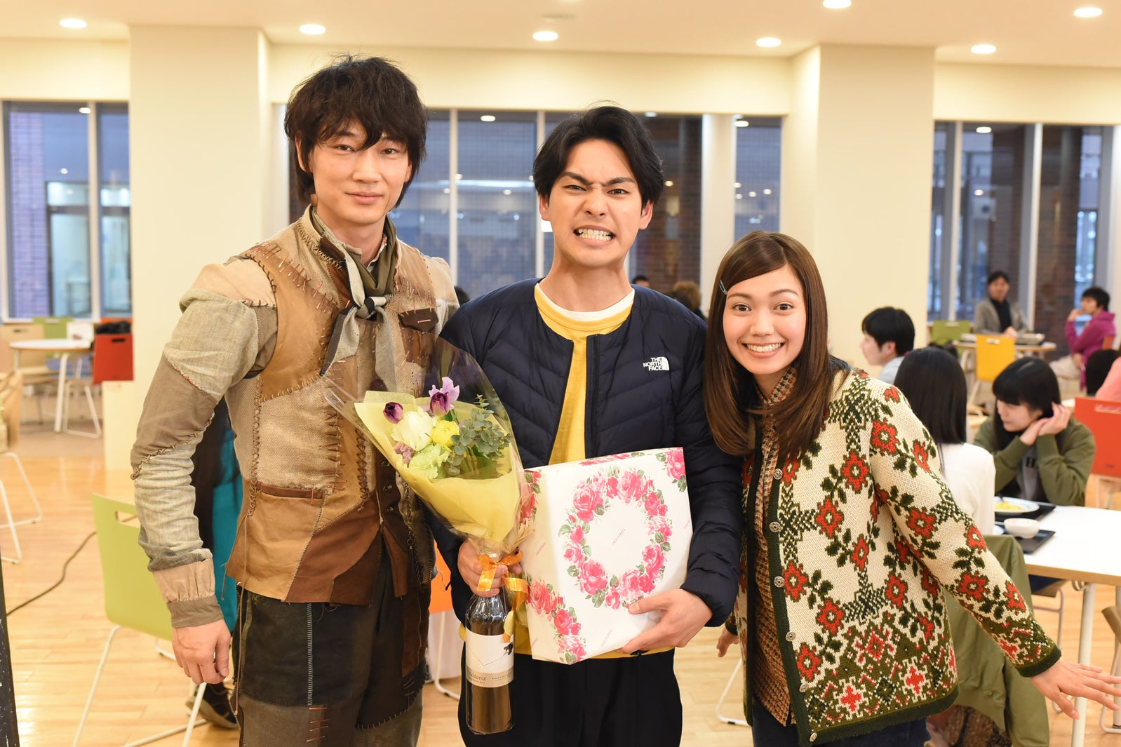 プレゼントや花束を抱えた柳楽を中心に、同作主演の綾野剛、ヒロインの二階堂ふみと並んだ3ショットを公開。笑顔の綾野と二階堂に挟まれた柳楽は、眉間を寄せ上下の歯を見せた“いー”の顔でお茶目に写った。