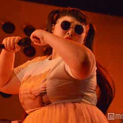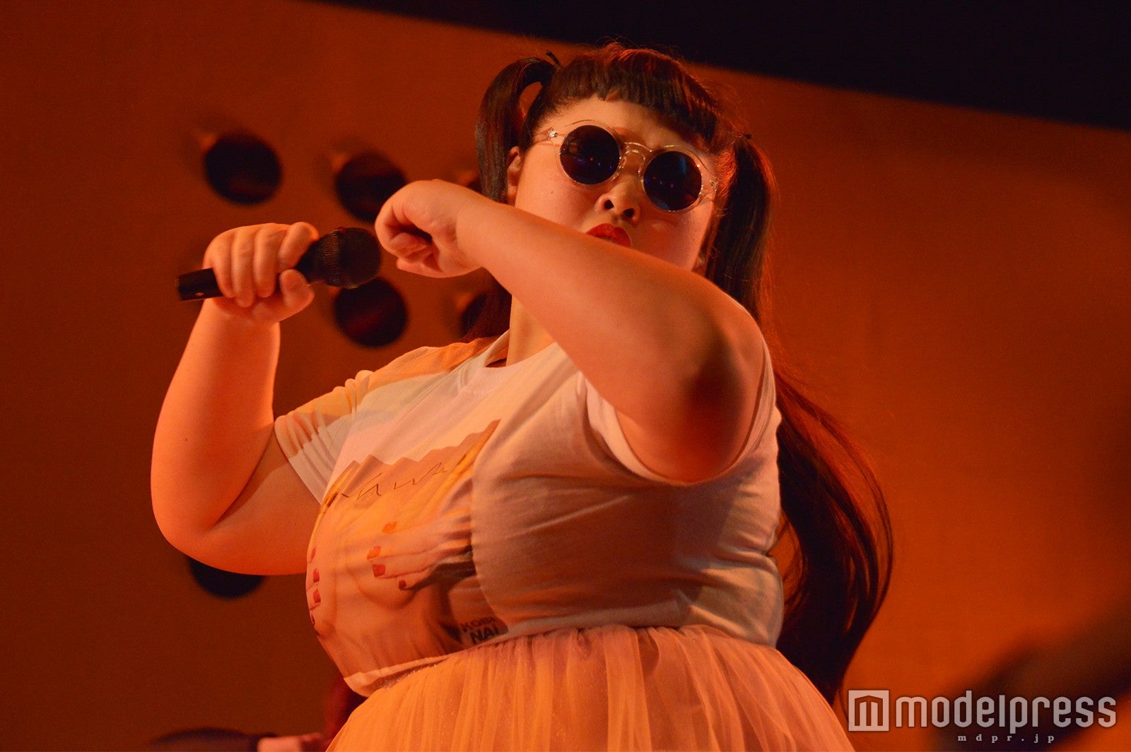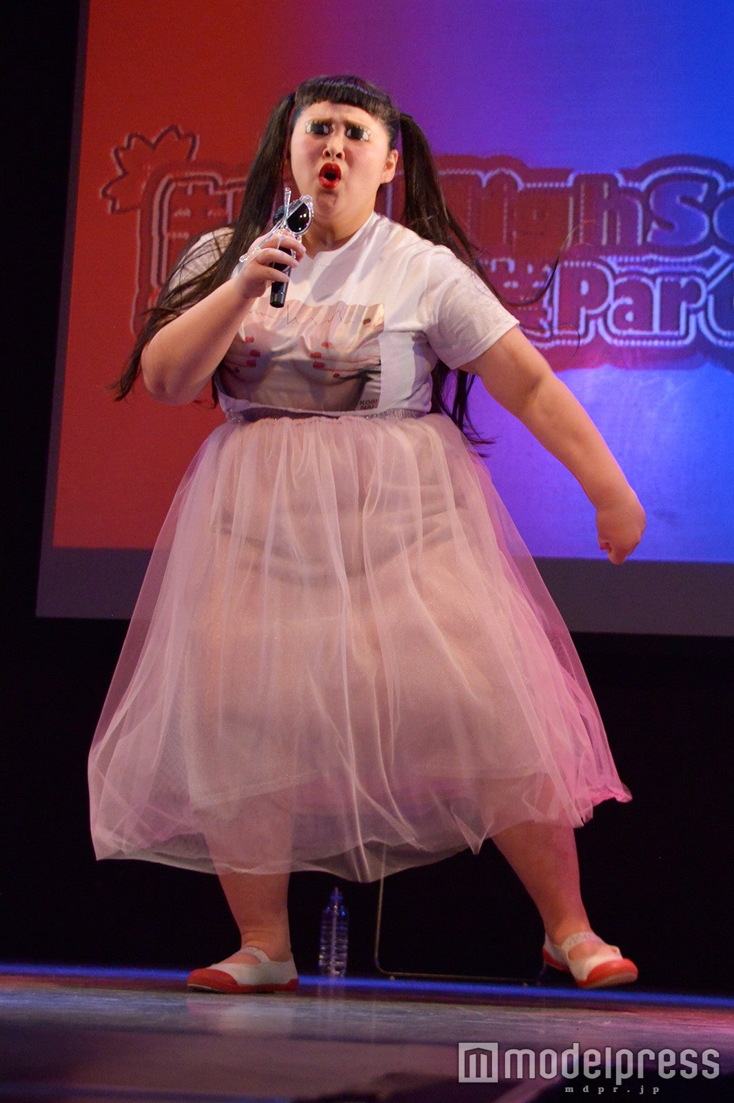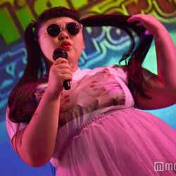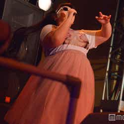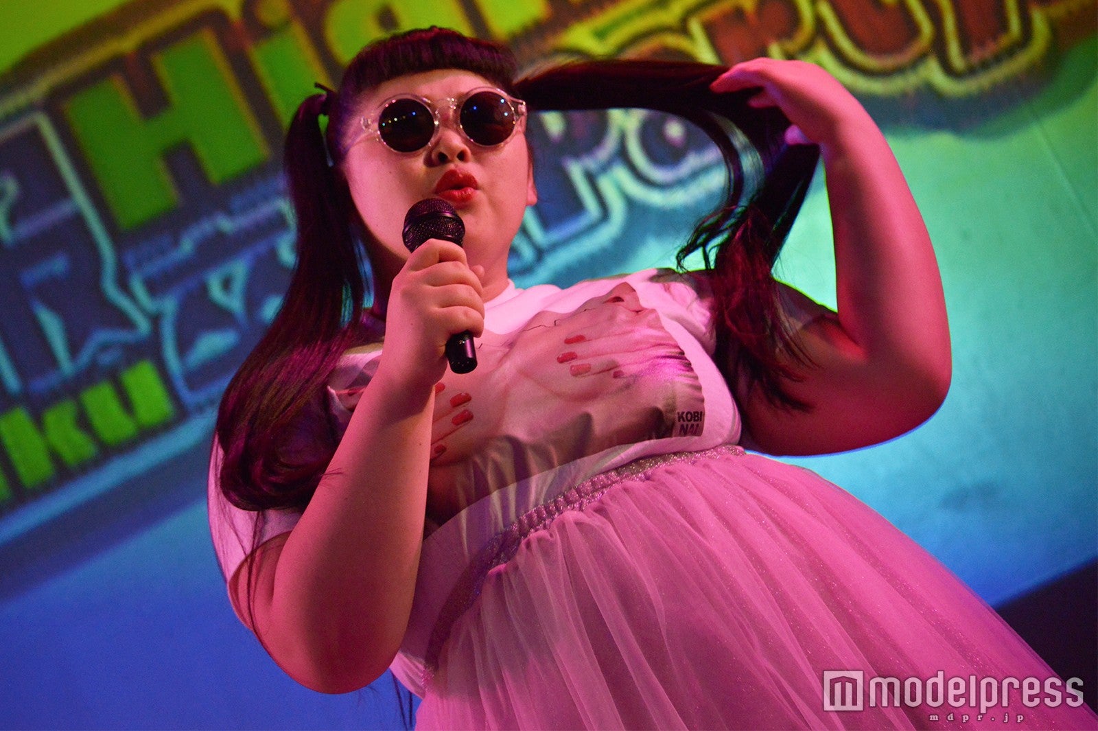 「渡辺直美…じゃないの!?」と思わず二度見してしまうほどそっくりなフォルム、POPなファッション&ヘアメイクで話題を呼んでいるみくぴは、様々な特技を持った高校生が次々と登場するスーパー高校生ステージに登場。ダンサー2人を従えパフォーマンスを開始し、渡辺を彷彿とさせる動きを見せるたびに会場に集まった女子高生は爆笑。途中ではステージに座り込み、水を飲むという動きまで渡辺を完コピし、2曲目「BORN THIS WAY」では、それまでつけていたサングラスをとり、レディーガガさながらの目玉メイクを披露し、沸かせた。