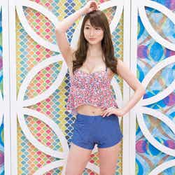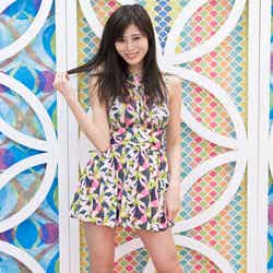 沖舘唯は花柄フレアビキニ&スカートで優雅なリゾートスタイルに。派手になりすぎないレッドの花柄でスタジオを華やかに彩った。