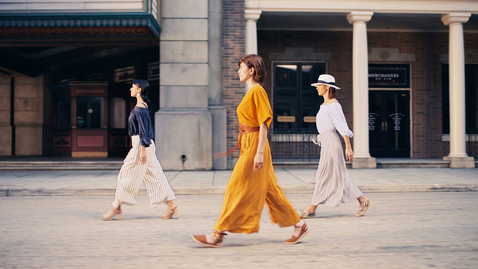 前回に続き、2017年春夏のイメージキャラクターもつとめる中条。内田有紀も出演している今作では、女性の気分が上がるコーディネートをテーマに、90年代に大ヒットしたスキャットマン・ジョンの代表曲「Scatman(SKI-BA-BOP-BA-DOP-BOP)」を、「パラッツォパンツ」という商品名を使った替え歌に特別アレンジ。その音楽にあわせて、内田と中条が、軽快なステップを披露している。