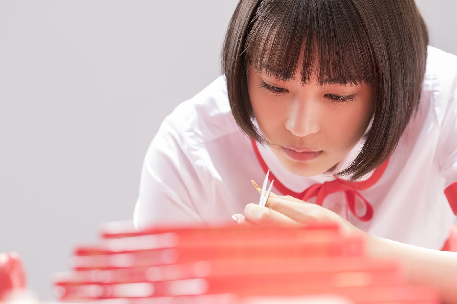 広瀬はひと綴りになったクマの切り紙を2人に広げて見せ、それをパッケージに貼り付け。