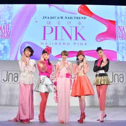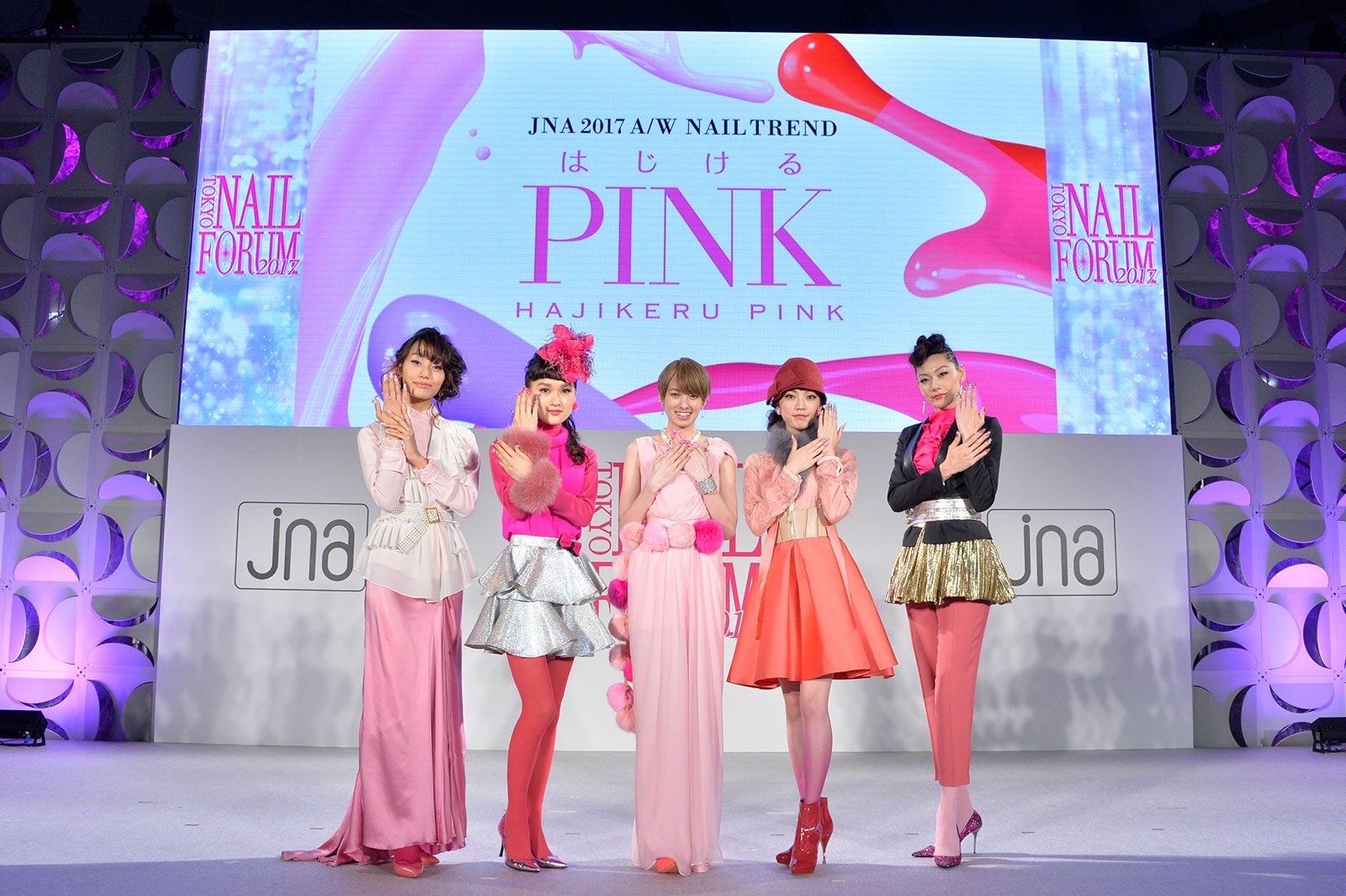 同イベントでは、NPO法人 日本ネイリスト協会が2017年秋冬のネイルトレンドとして設定したテーマ「はじけるPINK」が紹介され、作品を制作したデザイナーたちが登壇。その後、「はじけるPINK」を表現する4つのスタイルとして、「もう一度ピンク」「やっぱりピンク」「もっとピンク」「あえてピンク」のサブテーマに基づいて制作された作品を身に着けたモデルたちが登場した。