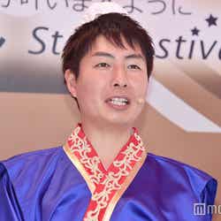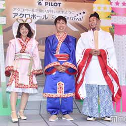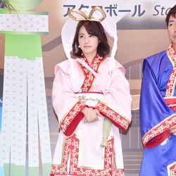 イベントでは、7月7日の七夕になぞらえ、織姫と彦星、そして神主の衣装を身にまとって登場した3人。磯山は織姫に扮したのは今回が初めてだそうで「装飾も彦星様と一緒ですしカワイイですね」と笑顔を見せたが、福田は「裏では衣装担当の方が、(磯山の)帯が締まらないってずっと絞っていました」と暴露。磯山は「そんなことないですよ!ギリギリ締まりましたよ!コルセットみたいになっていますけど(笑)」と苦笑いを浮かべた。